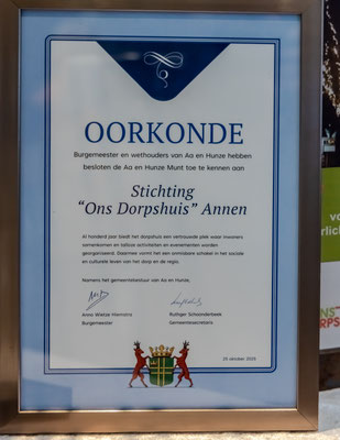 Op zaterdag werden vrijwilligers van het Dorpshuis met een feestelijke lunch bedankt voor hun inzet. Aansluitend vond er een receptie voor bijna 100 genodigden plaats met aandacht voor de rijke geschiedenis van Ons Dorpshuis, én een blik op de toekomst. Van de gemeente Aa en Hunze kreeg Ons Dorpshuis als eerste de Aa en Hunze munt uitgereikt als erkenning voor hun 100-jarige bijdrage aan de leefbaarheid van Annen en omstreken. Het bestuur was verguld met dit gebaar van erkenning en deelt deze graag met alle vrijwilligers die zich in de afgelopen 100 jaar hebben ingezet voor Ons Dorpshuis..
